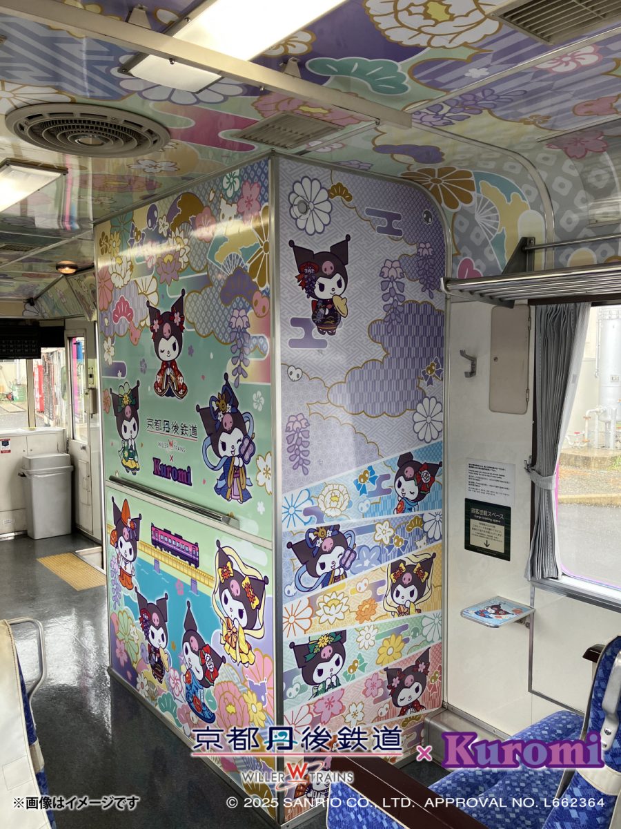 この列車は、サンリオの人気キャラクター「クロミ」が丹後七姫をイメージした華やかな装いでデザインされており、外装だけでなく車内にも可愛らしい装飾が施されています。
