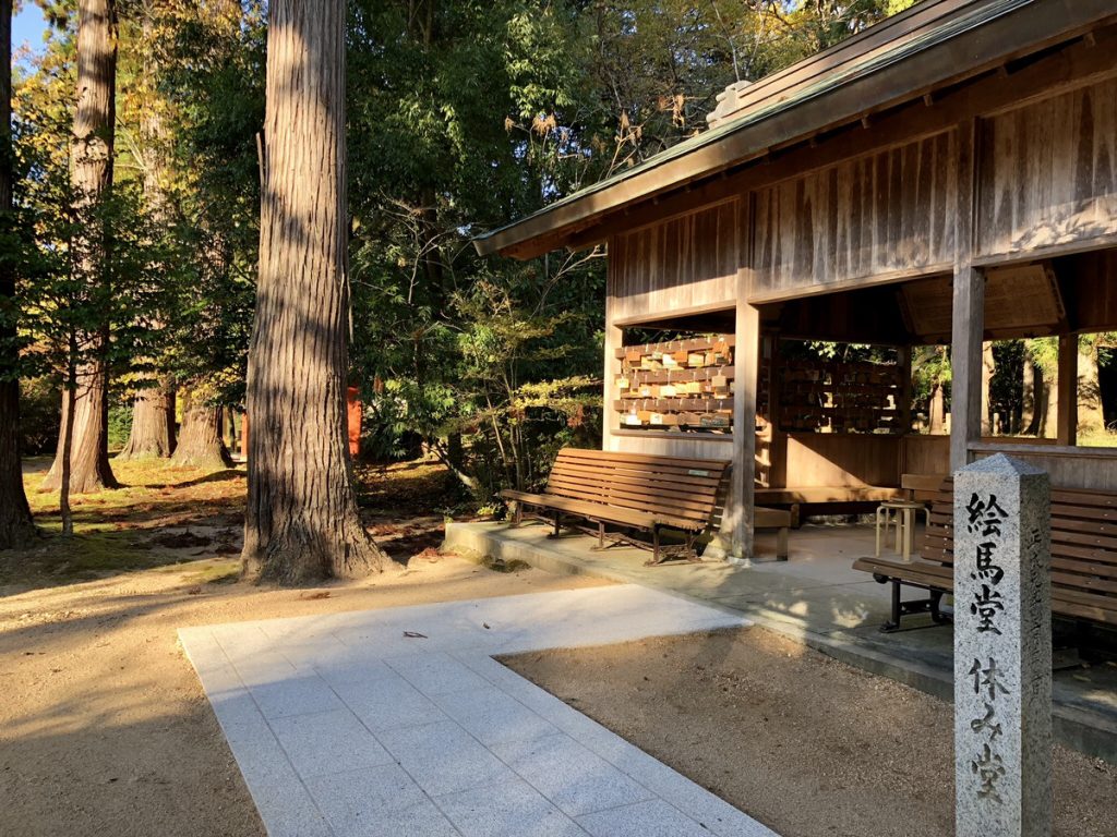 神社では参拝してすぐ帰ってしまいがちですが、ここには「絵馬堂・休み堂」がありますので、ゆったりと、ぼんやりと木々を眺めながら、心が落ち着くまで一休みしてみるのはいかがでしょうか。