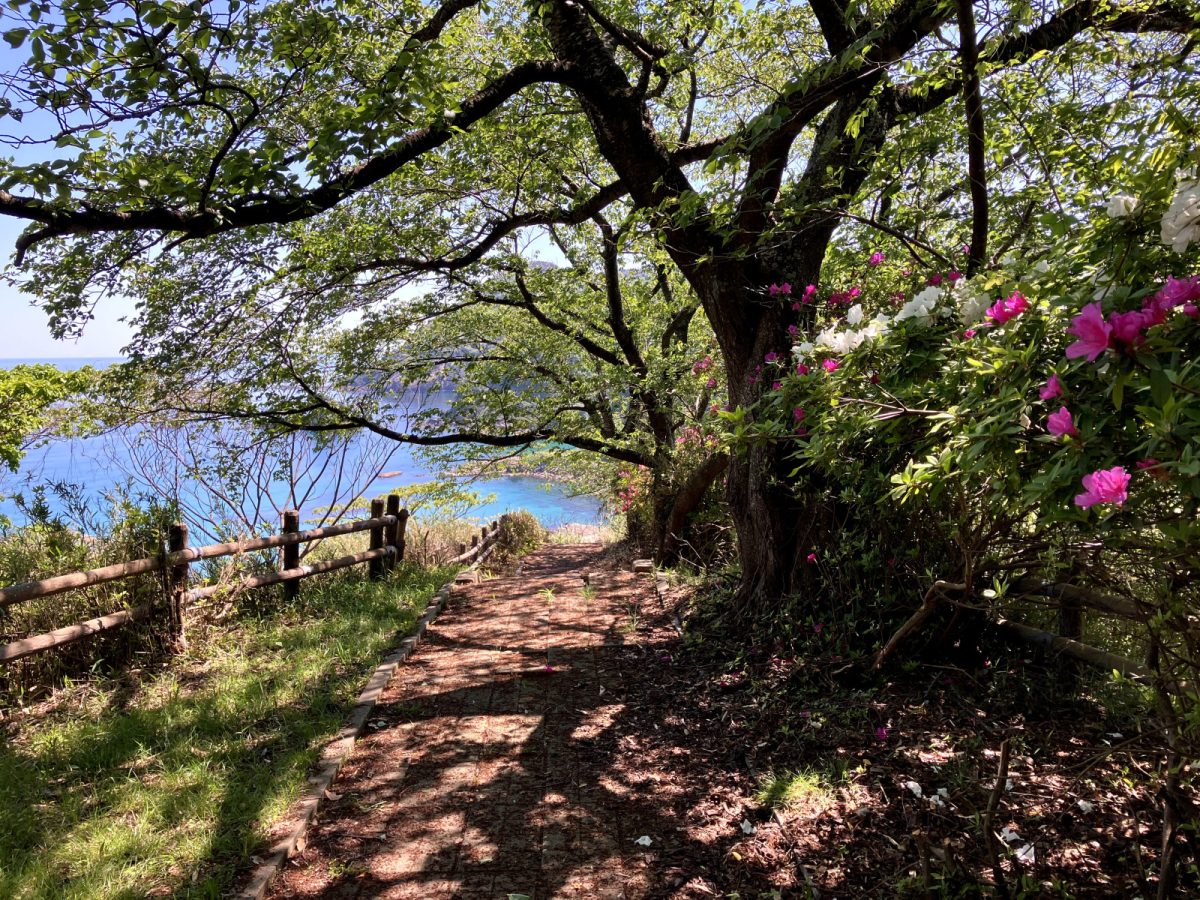 入り口からは、整備されたやや急な階段や遊歩道を進みます。山頂にいく途中、緑の樹々の間からみえる竹野浜の青い海の景色を眺めることができます。立ち止まりながら、景色を楽しんでください。