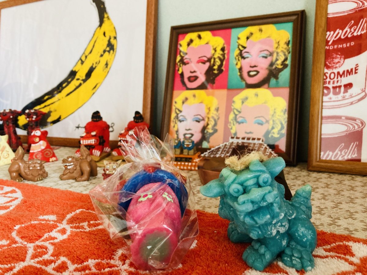 店内にはポップアートや伝統工芸品、シーサー、アンティークアイテムが華やかに並んでいます